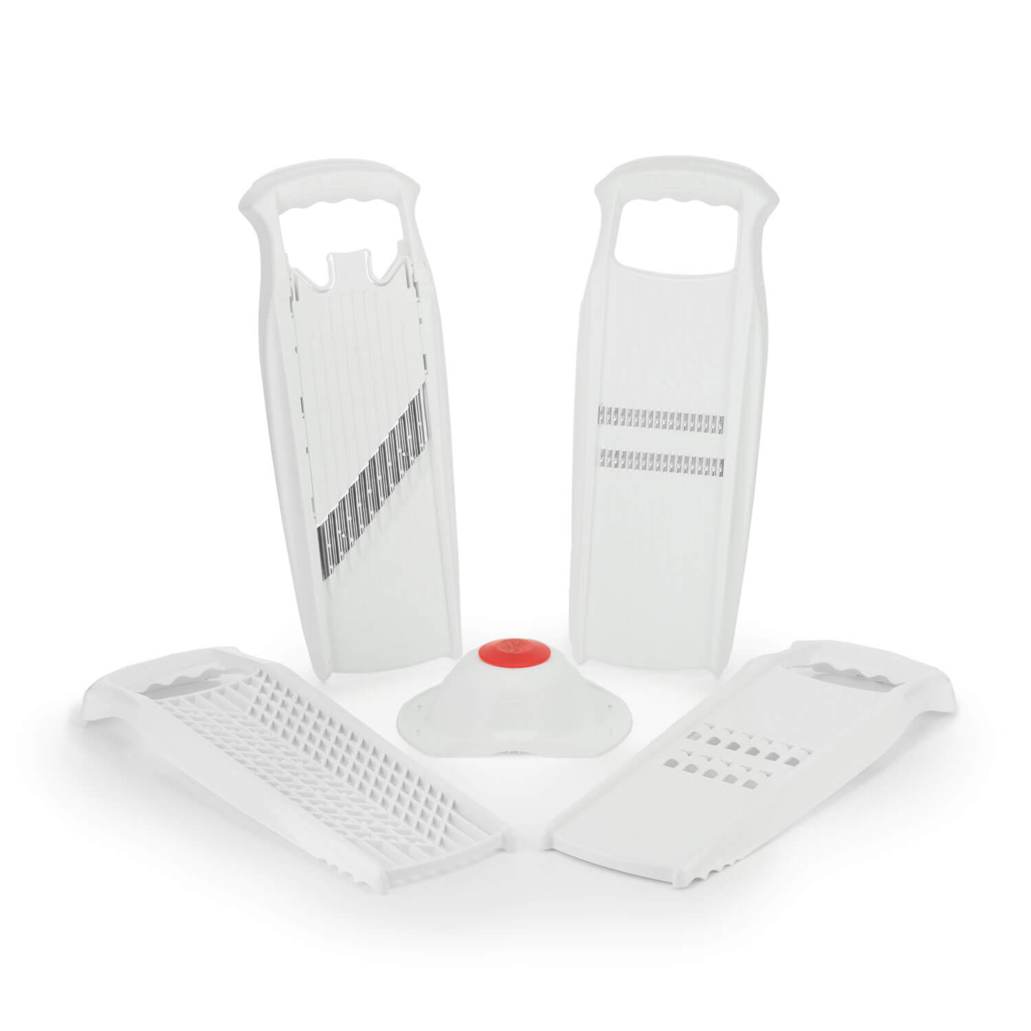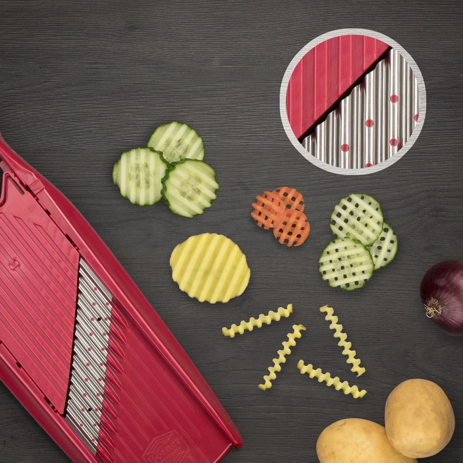 Dit leuke apparaat snijdt alle vaste groenten en fruit in een wafelstructuur (met gaatjes) of gekartelde schijfjes. Er zijn drie standen. Grof voor gekartelde, dikkere schijven, een fijne stand voor wafelstructuur en de stand helemaal dicht als veiligheid.